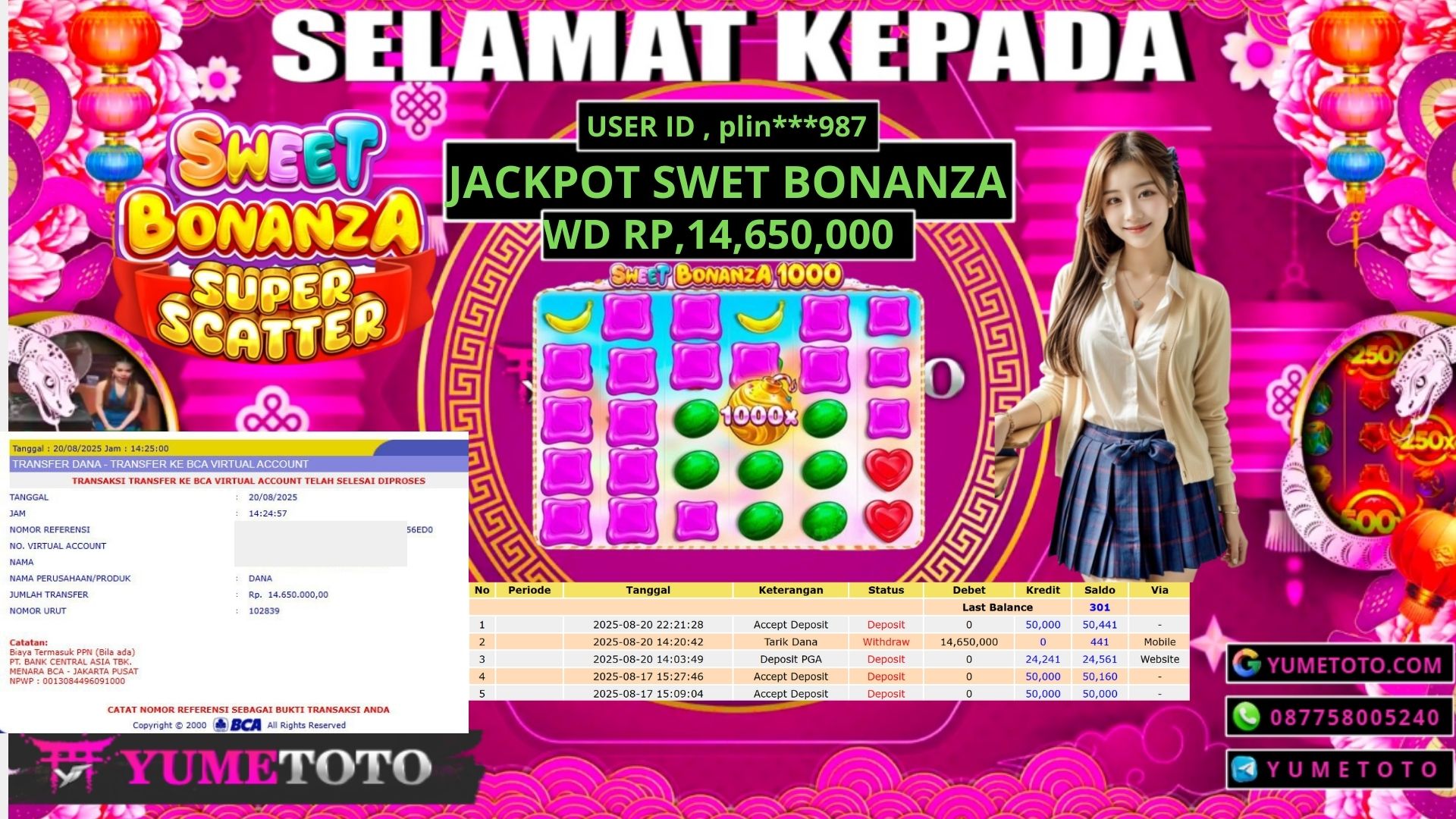 Dengan demikian kami sampaikan selamat kepada member kami yang berhasil mendapatkan jackpot paus dan ucapan terimakasih sebesar-besarnya karena telah memilih YUMETOTO sebagai Situs Bandar Online Terpercaya.